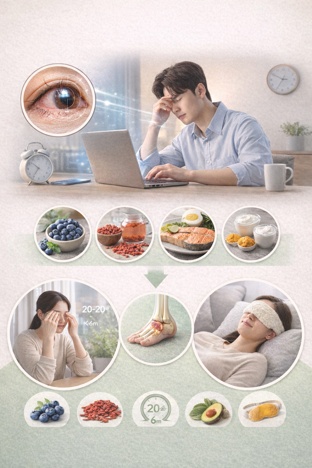 | 잘못된 자세 | 목·어깨 혈류 감소 | 눈 피로 악화, 디스크 |