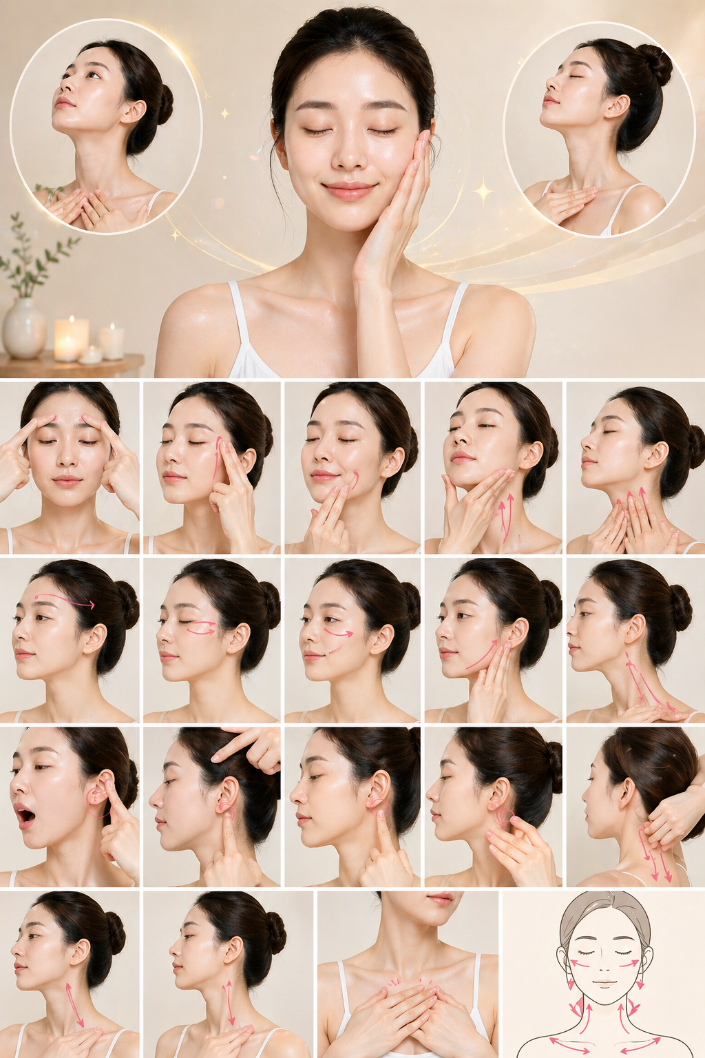 얼굴 소멸 셀프 마사지는 몇 가지 핵심 단계로 구성되어 있으며, 각 동작마다 자극하는 림프절과 근육이 다릅니다. 올바른 순서와 방향을 지키는 것이 효과를 극대화하는 핵심입니다.